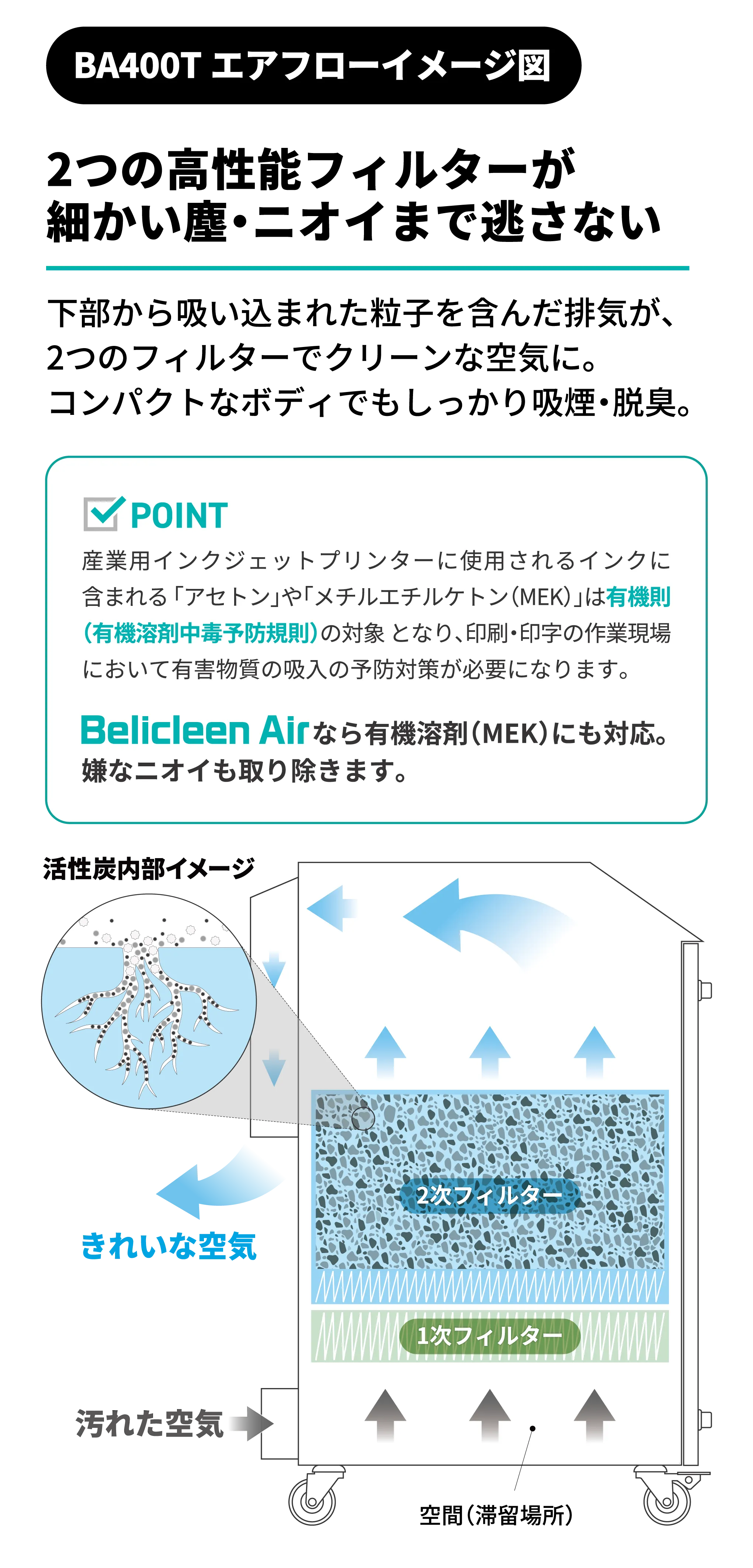 - 大容量活性炭フィルターでMEK・VOC(揮発性有機化合物)を吸着
