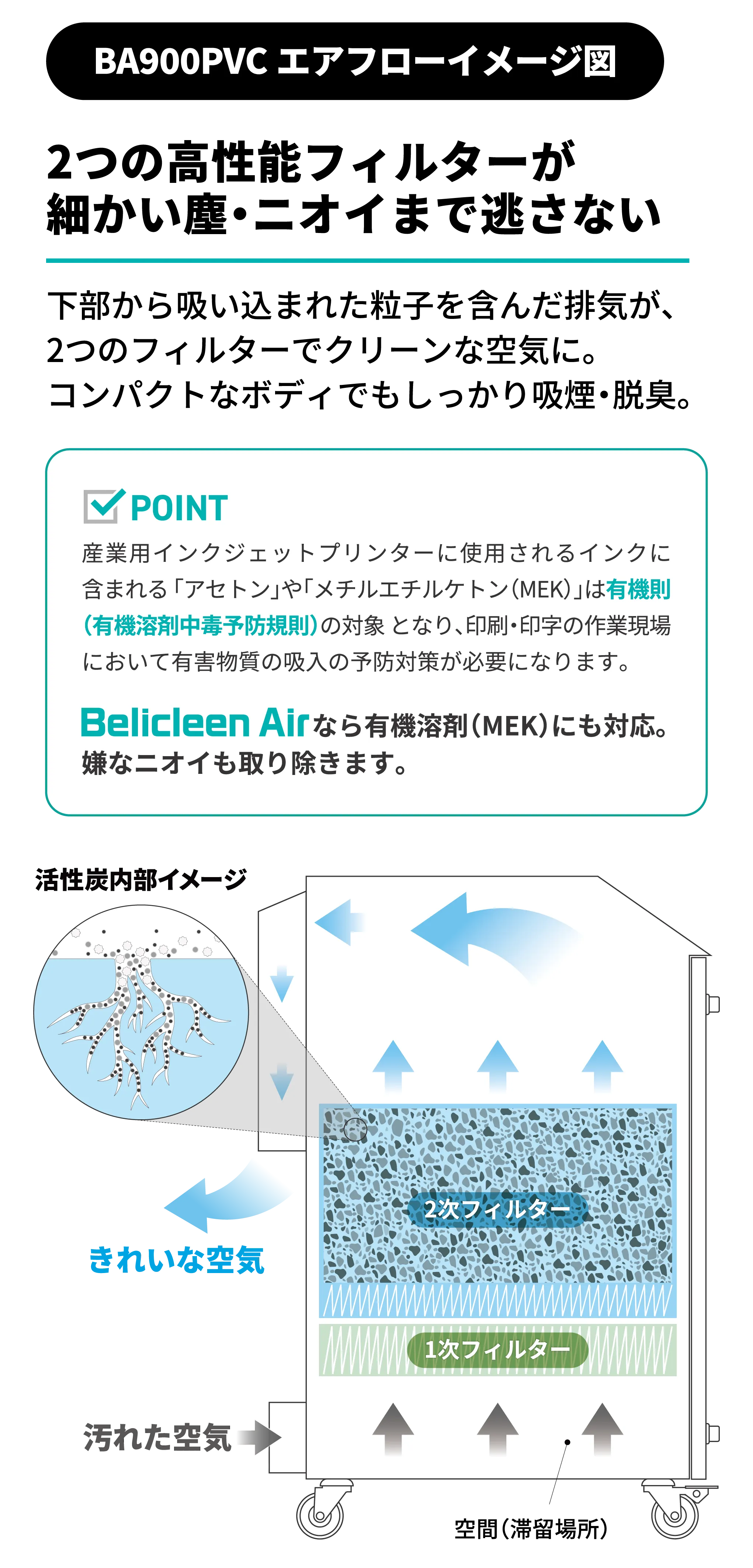 - 大容量活性炭フィルターでMEK・VOC(揮発性有機化合物)を吸着