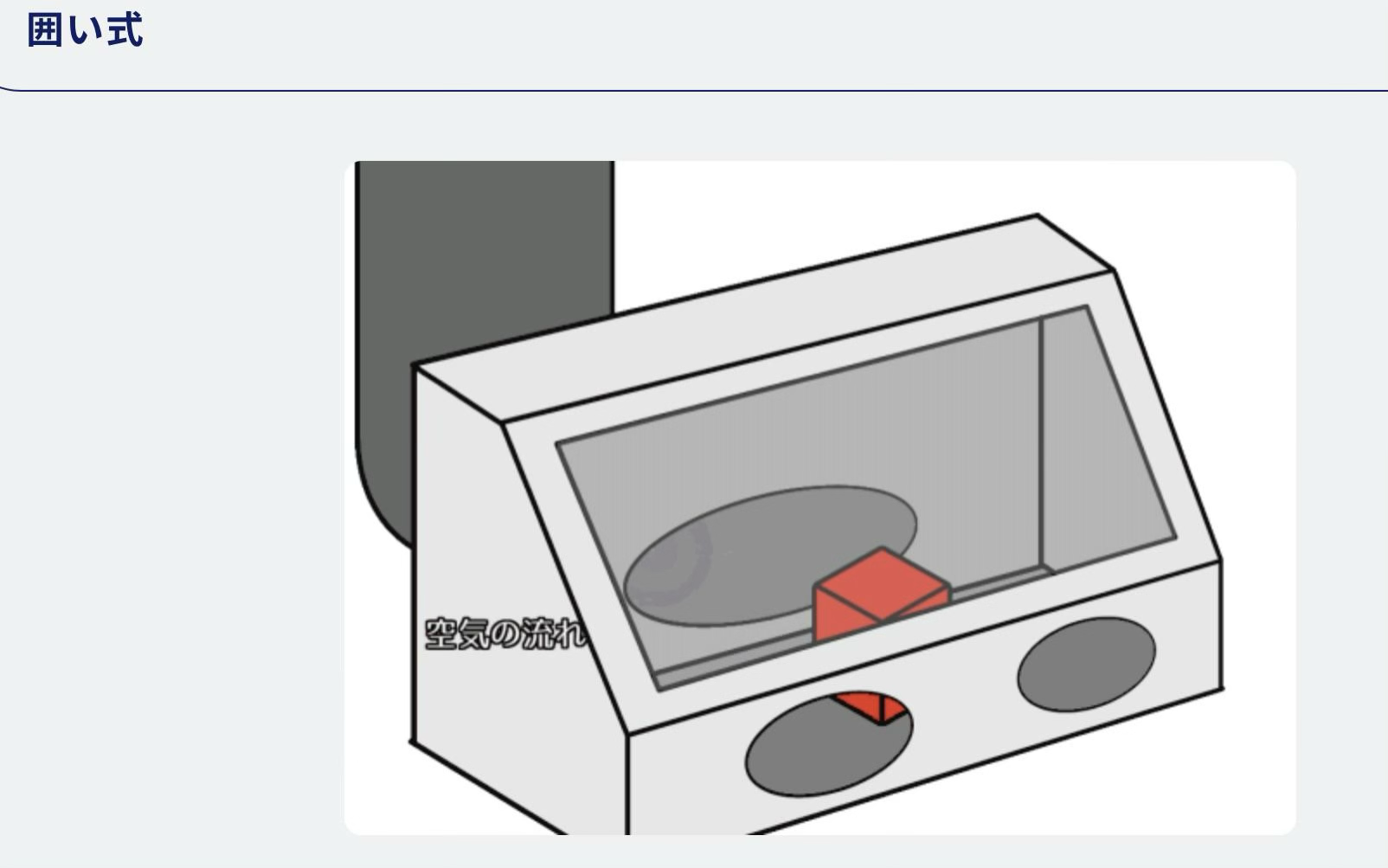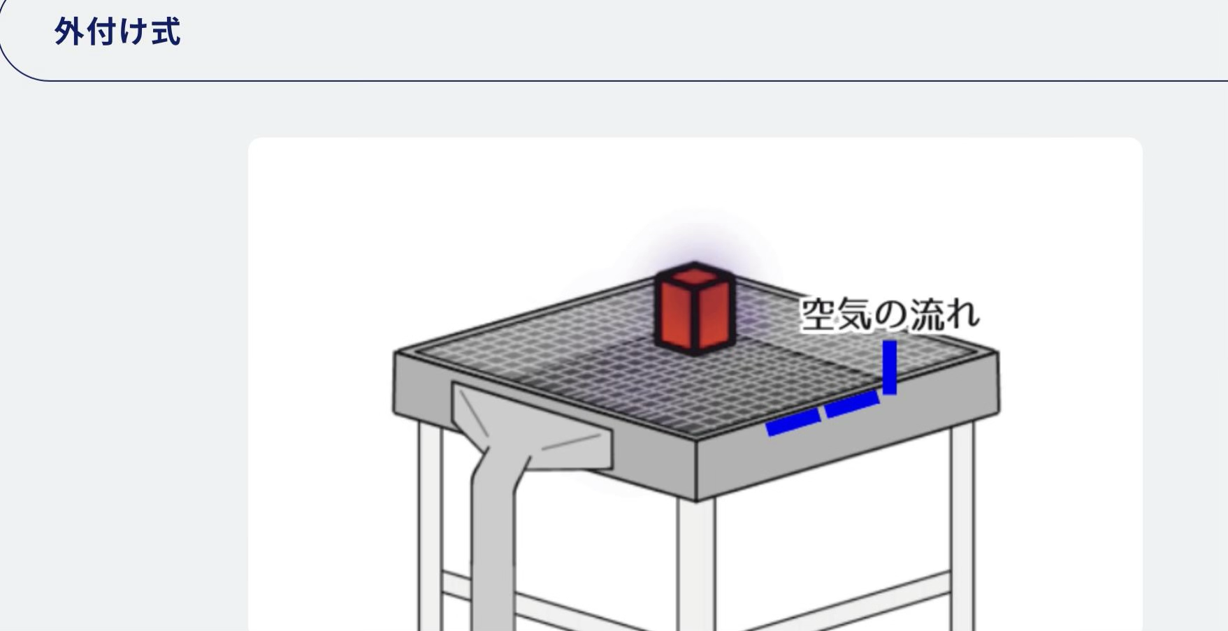 - 密閉式(送風機なし):換気エリアは密閉されているが、プッシュ気流を持たず吸引のみで換気するタイプ