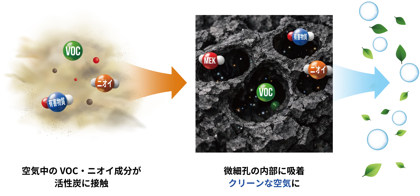 活性炭は、無数の微細な孔(細孔構造)を持つ多孔質素材です。 その総表面積はわずか1gでテニスコート数面分にもなるほどで、 この広大な表面積こそがVOC(揮発性有機化合物)や嫌なニオイを取り除くカギになります。 孔の表面にVOC分子を物理的に吸着することで空気中のVOCを効率的に除去。 燃焼や薬品処理を行わず、物理吸着によってVOCや臭気を除去するため、安全性が高く、安定した運用が可能です。